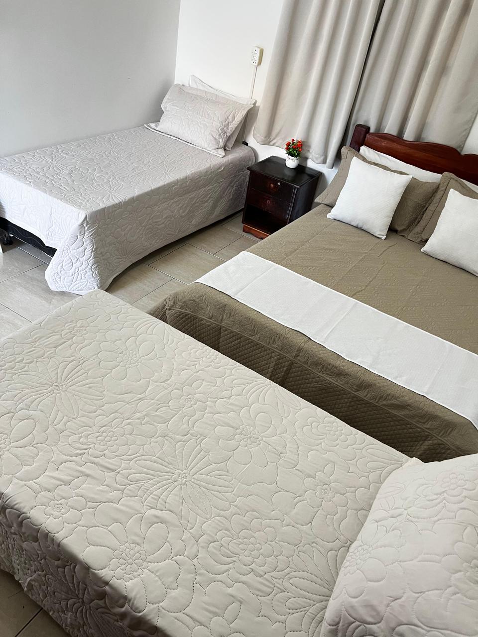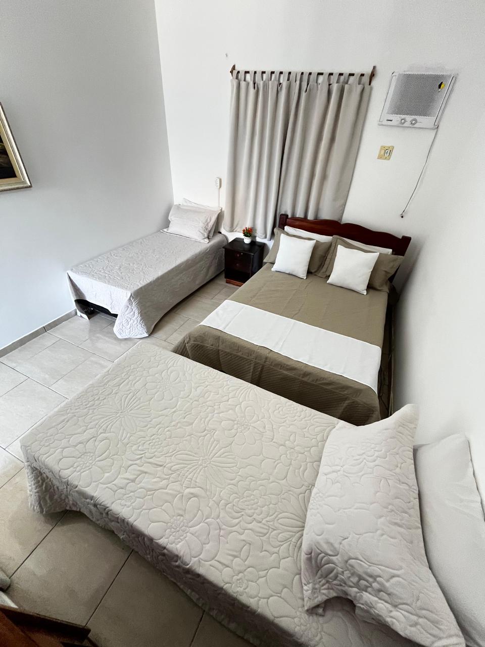 Suíte mobiliada com 1 cama de casal e duas de solteiro, com mobília tradicional, smart tv, frigobar. Banheiro privativo, instalações novas e organizadas. Disponibilizamos roupa de cama, lençol, mantinha e toalhas. Acomoda 3 pessoas;